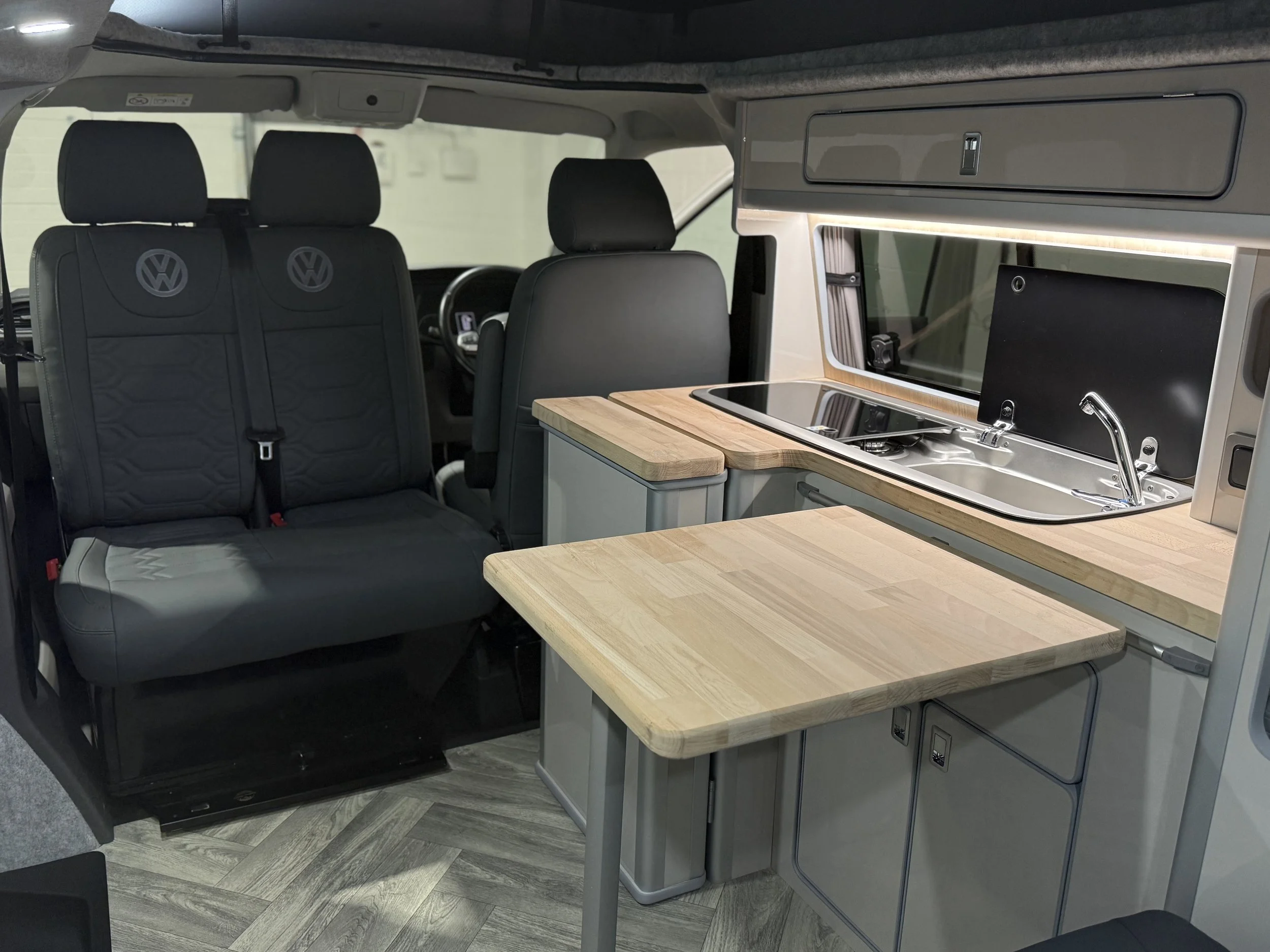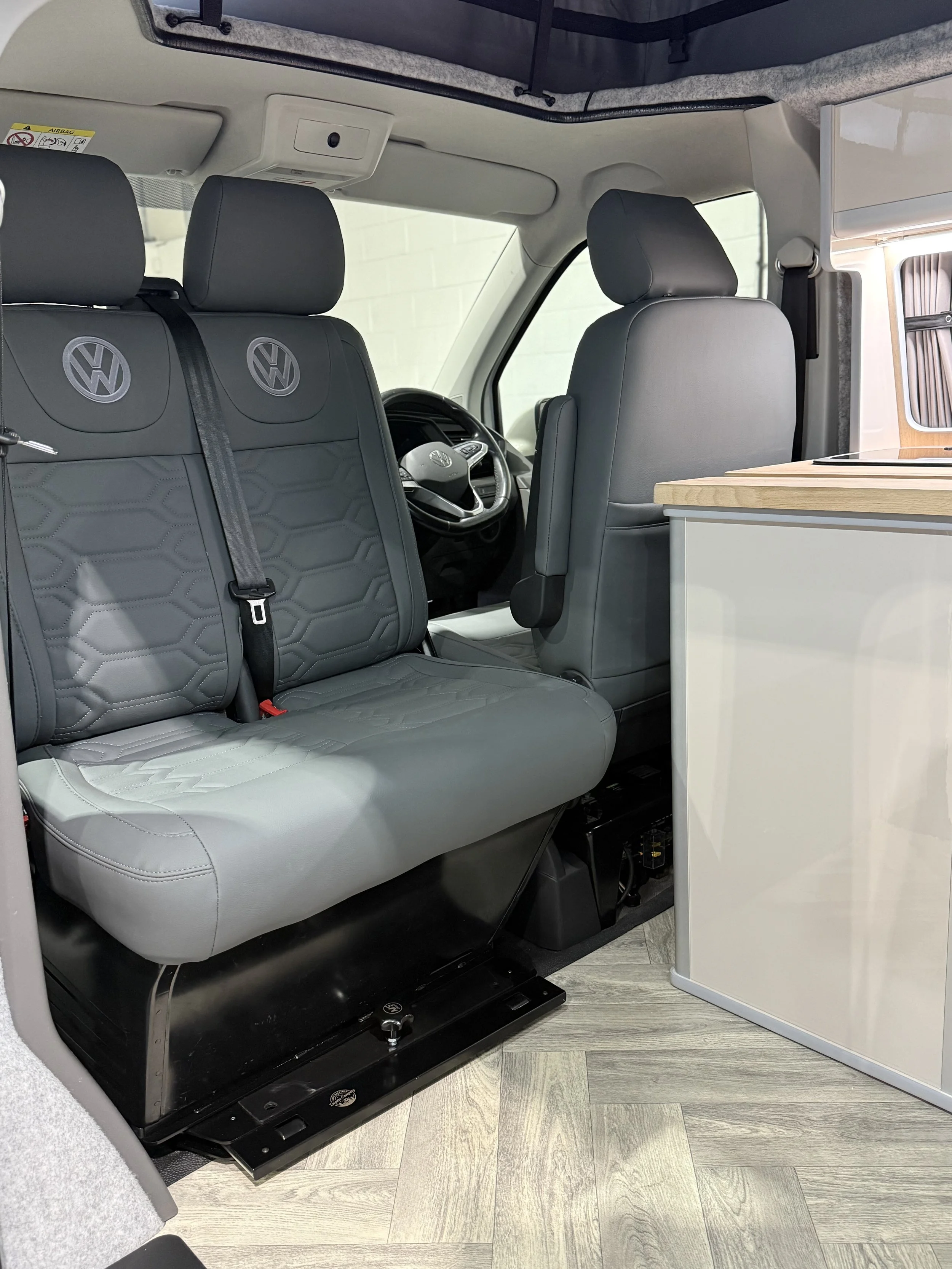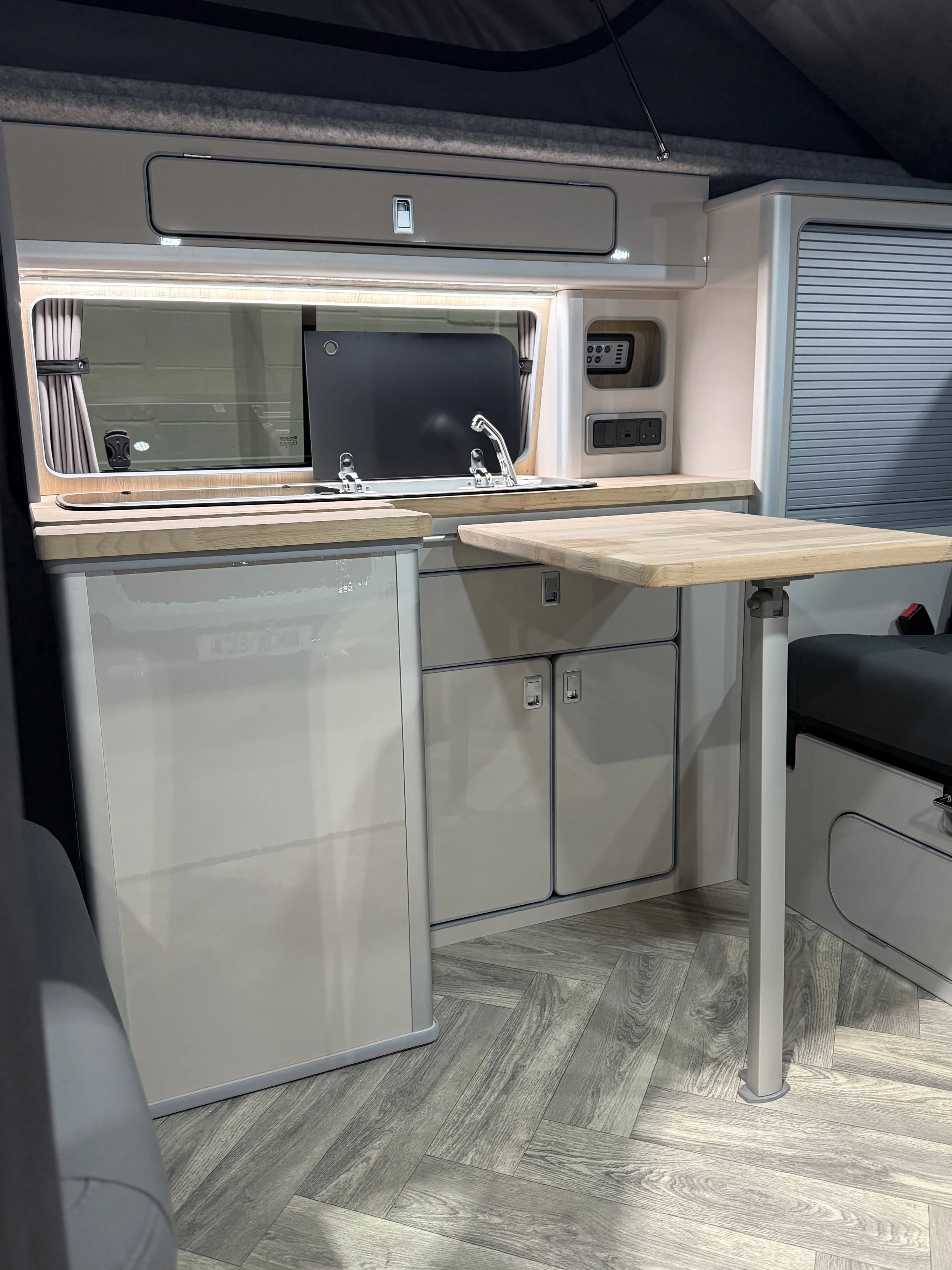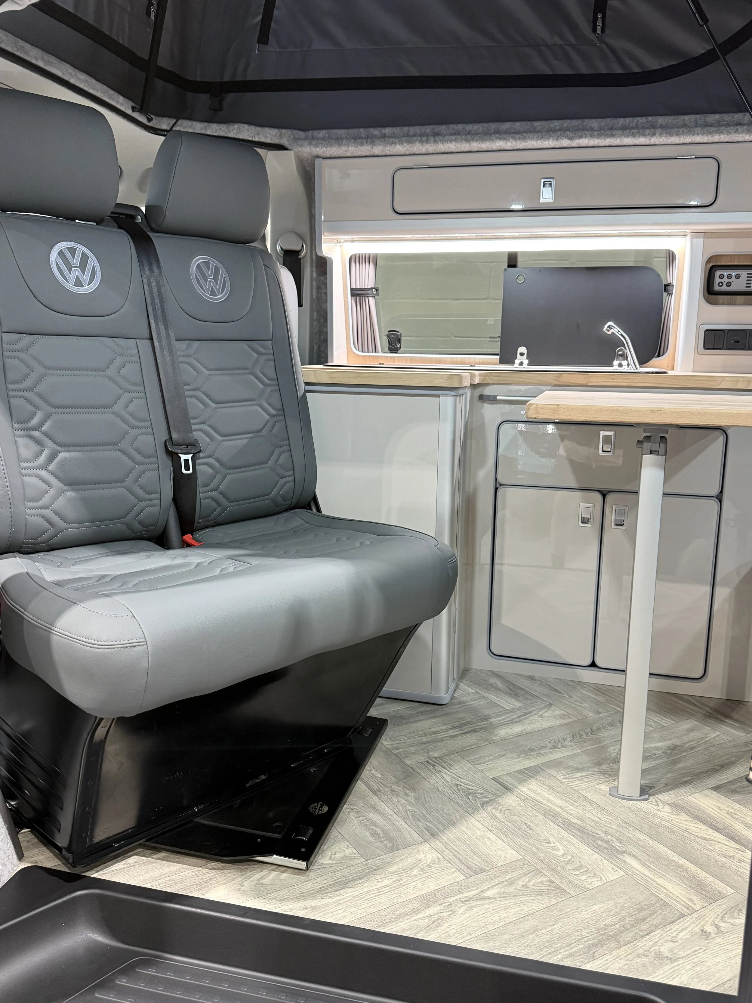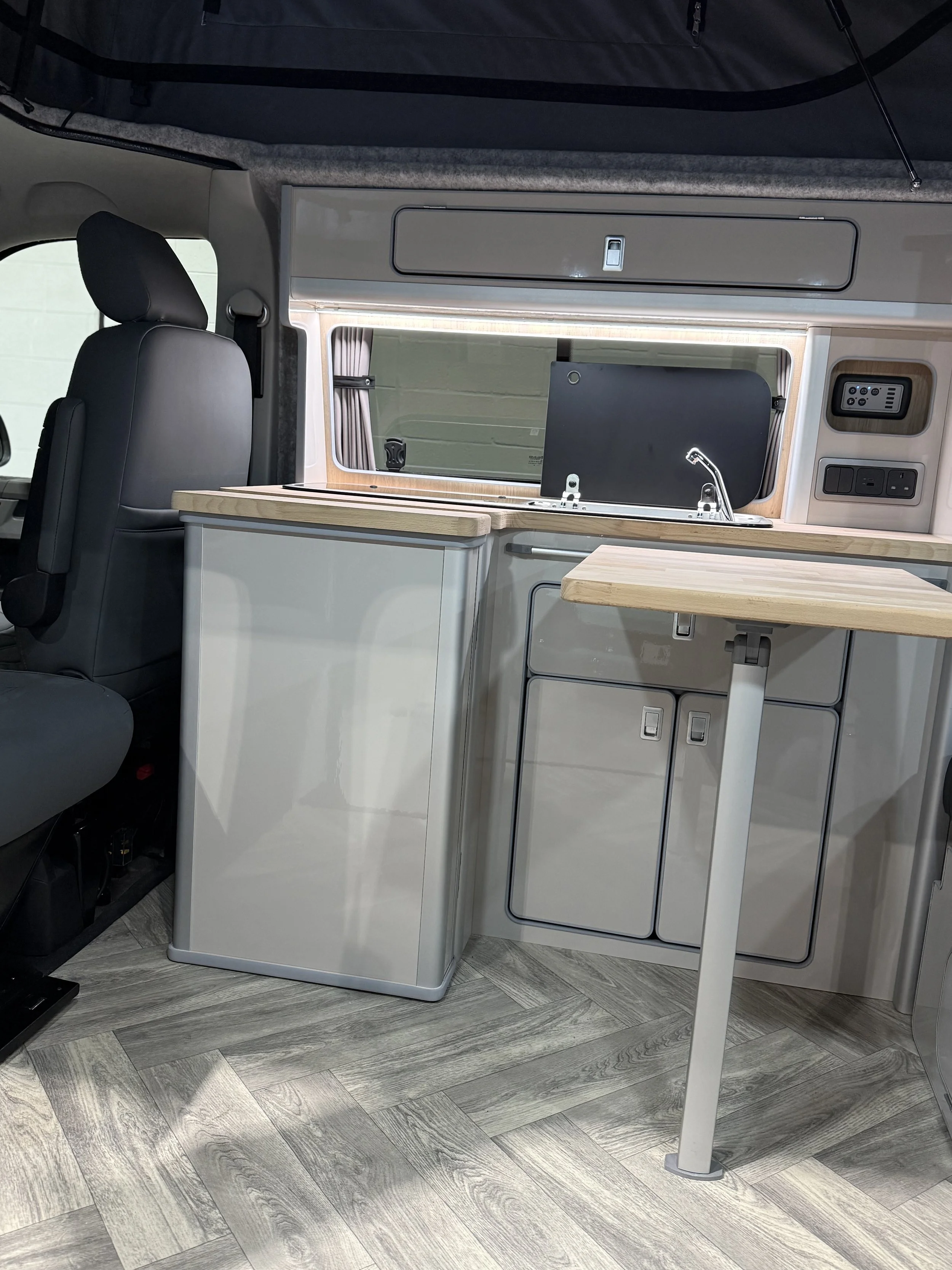 4 birth conversion with pop top and bed, Compressor fridge, double hob & sink, Sargent power unit, 240 hook up, curtains, fully insulated, split charger, LED Lighting, 110AH leisure battery, Fabworx tested & certified rock and roll bed with 5 stage reclining mechanism, Front swivel and slide passenger seats,