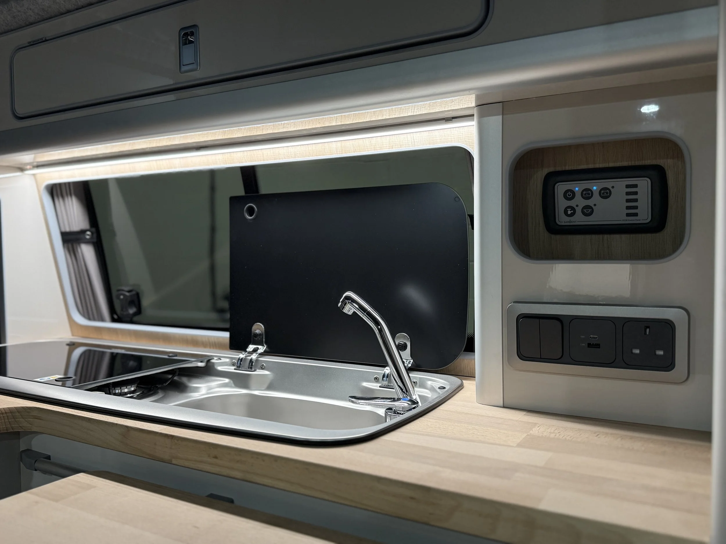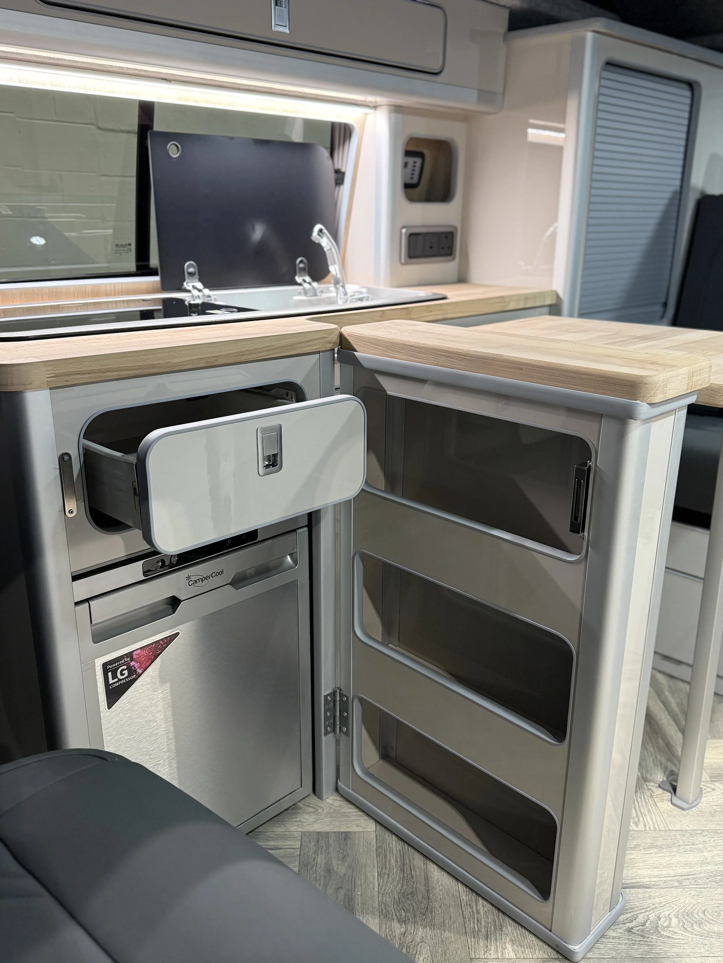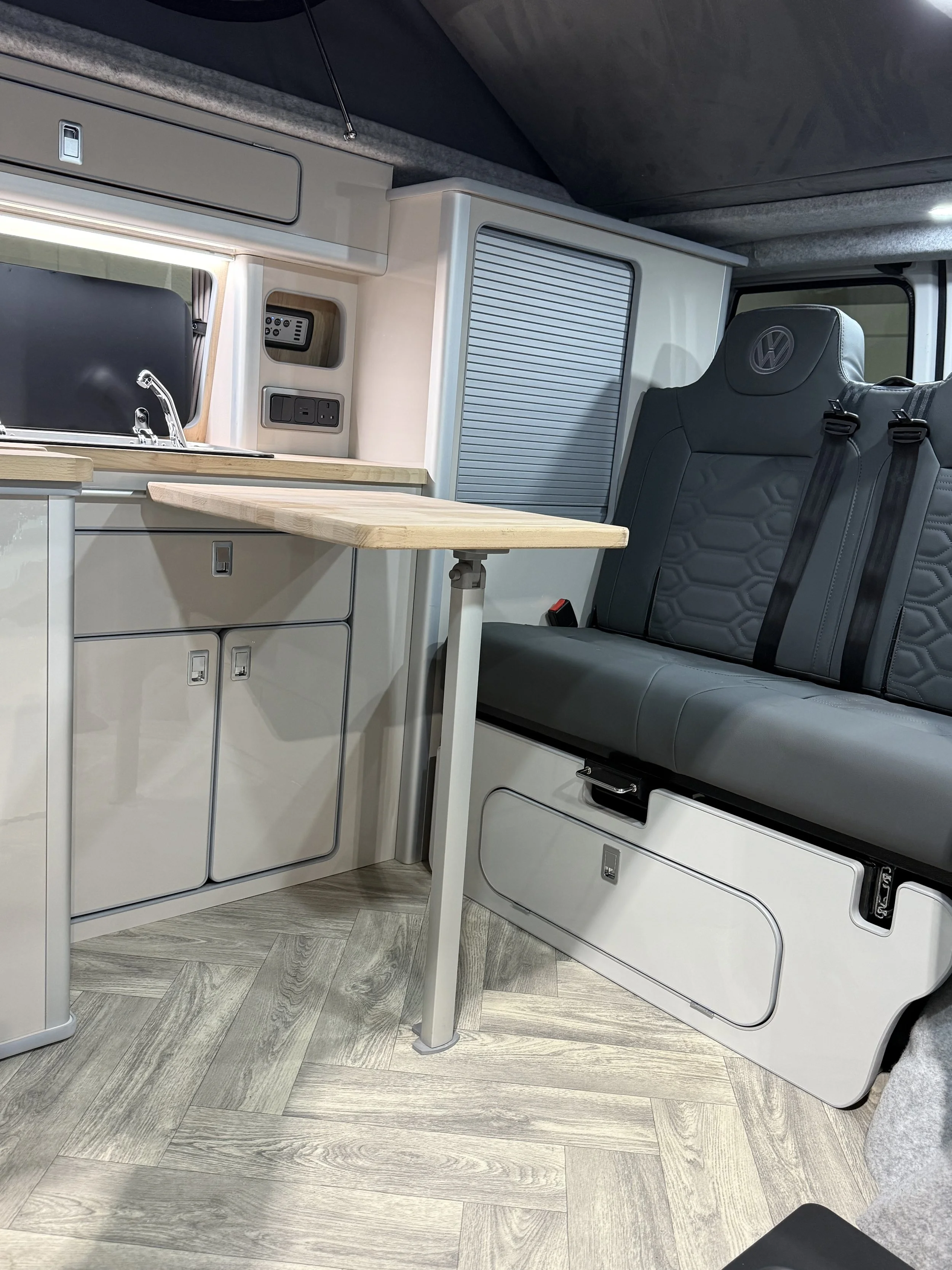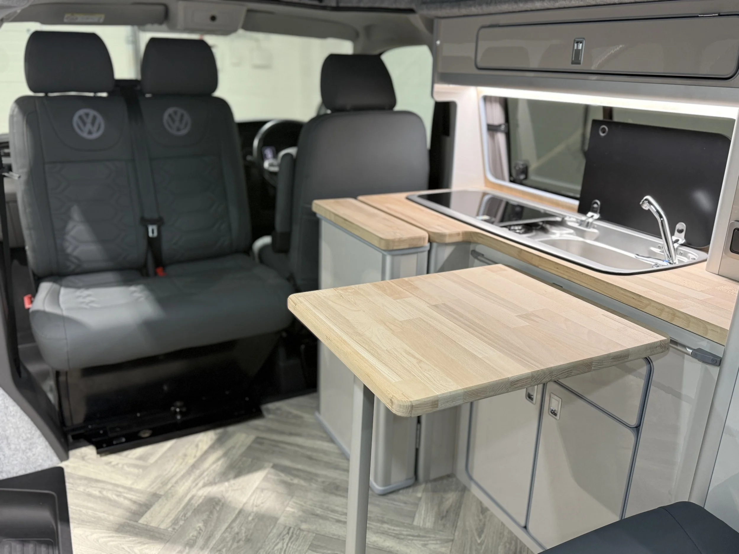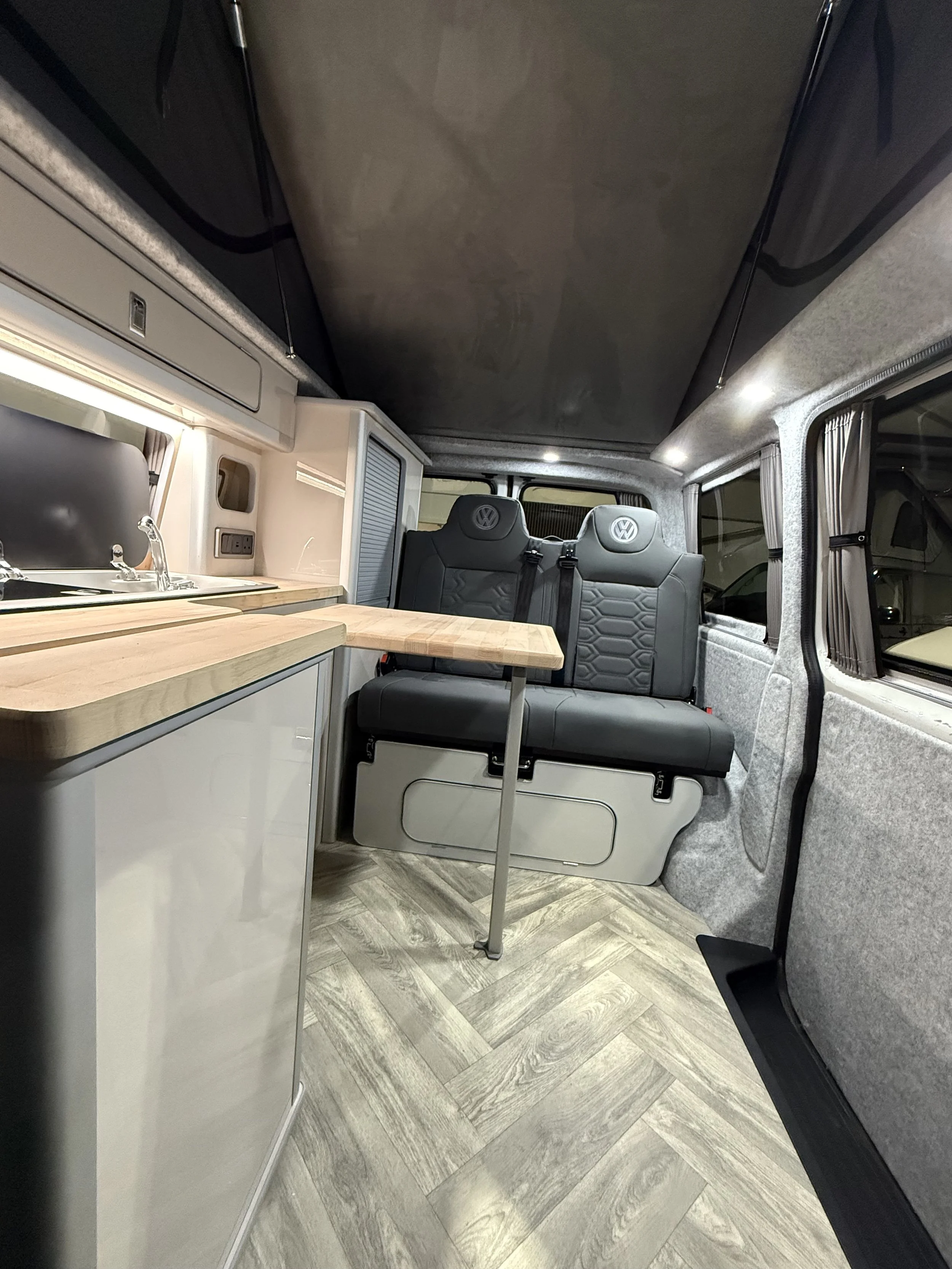 4 birth conversion with pop top and bed, Compressor fridge, double hob & sink, Sargent power unit, 240 hook up, curtains, fully insulated, split charger, LED Lighting, 110AH leisure battery, Fabworx tested & certified rock and roll bed with 5 stage reclining mechanism, Front swivel and slide passenger seats,